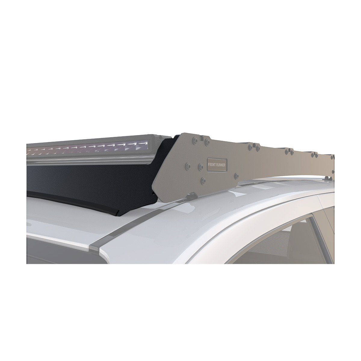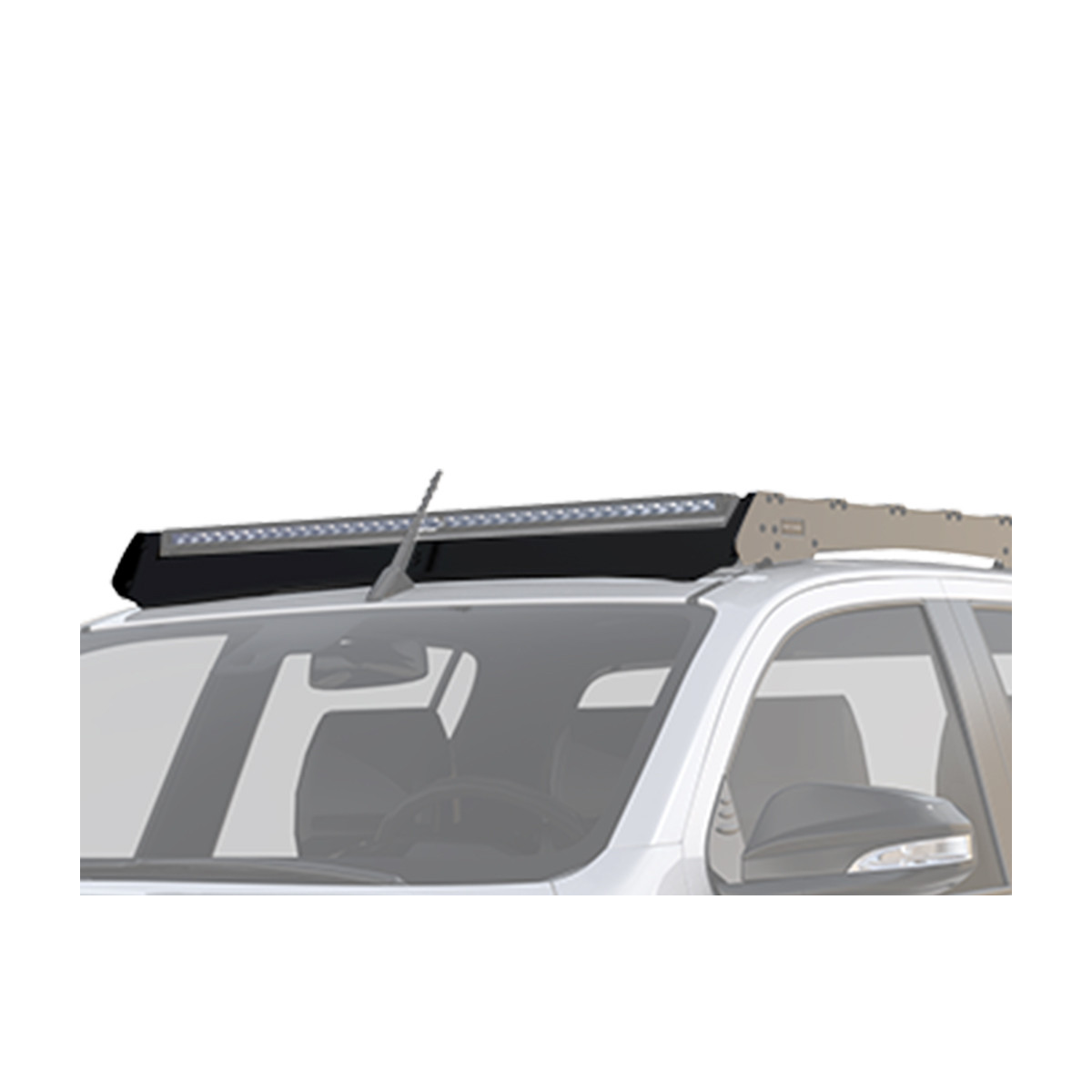 Le déflecteur permet l'installation de la barre lumineuse Front Runner LIGH213BP, assurant une circulation d'air fluide au-dessus de la galerie et des accessoires, réduisant ainsi la traînée et le bruit du vent. Il contribue également à diminuer la consommation de carburant lors du transport de charges volumineuses. Une lame de caoutchouc durable est fixée au bord inférieur du carénage pour sceller les brèches et protéger le toit lors des déplacements sur terrain accidenté.