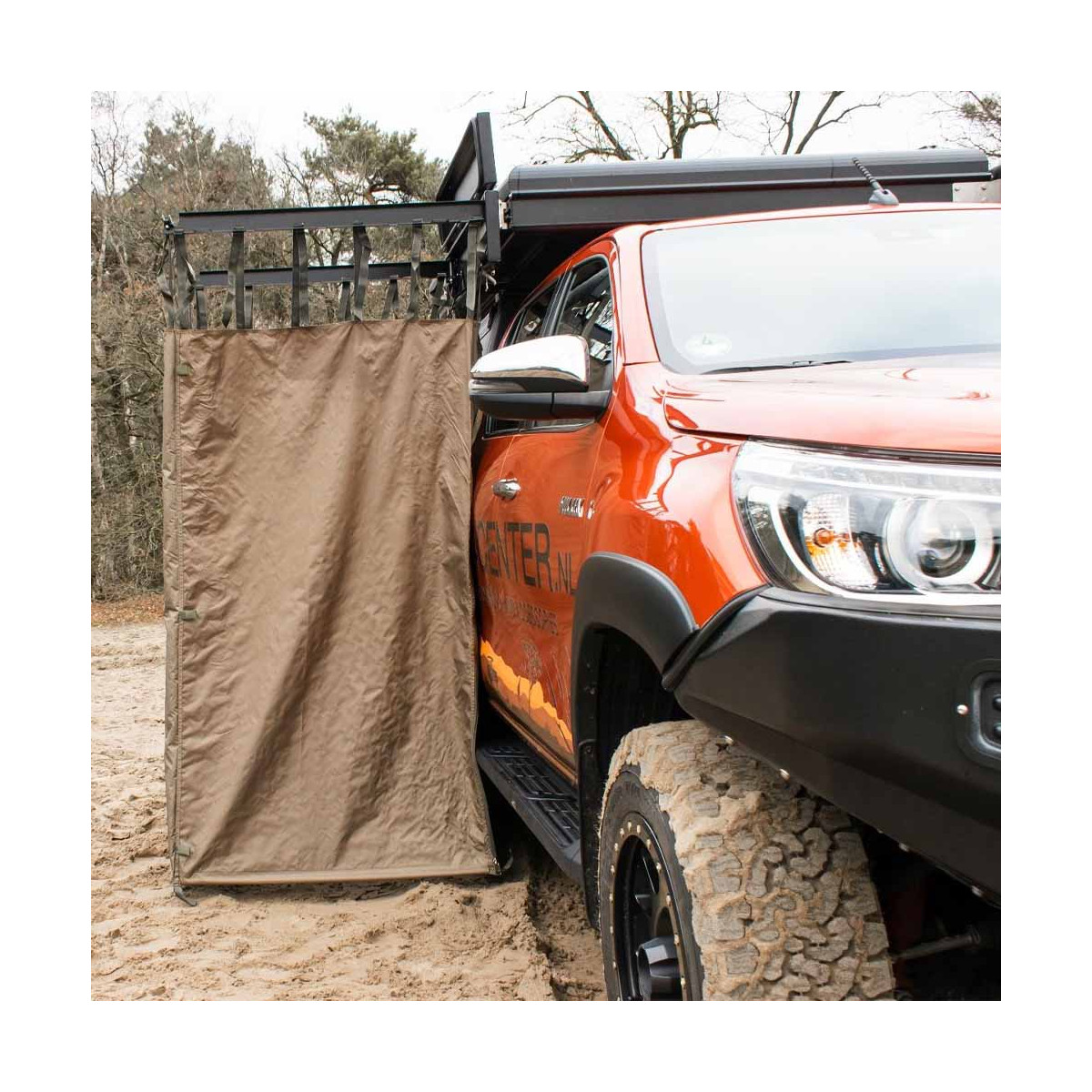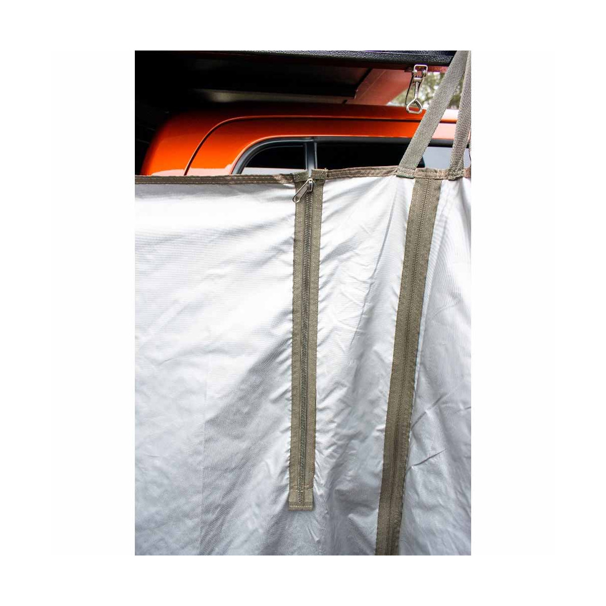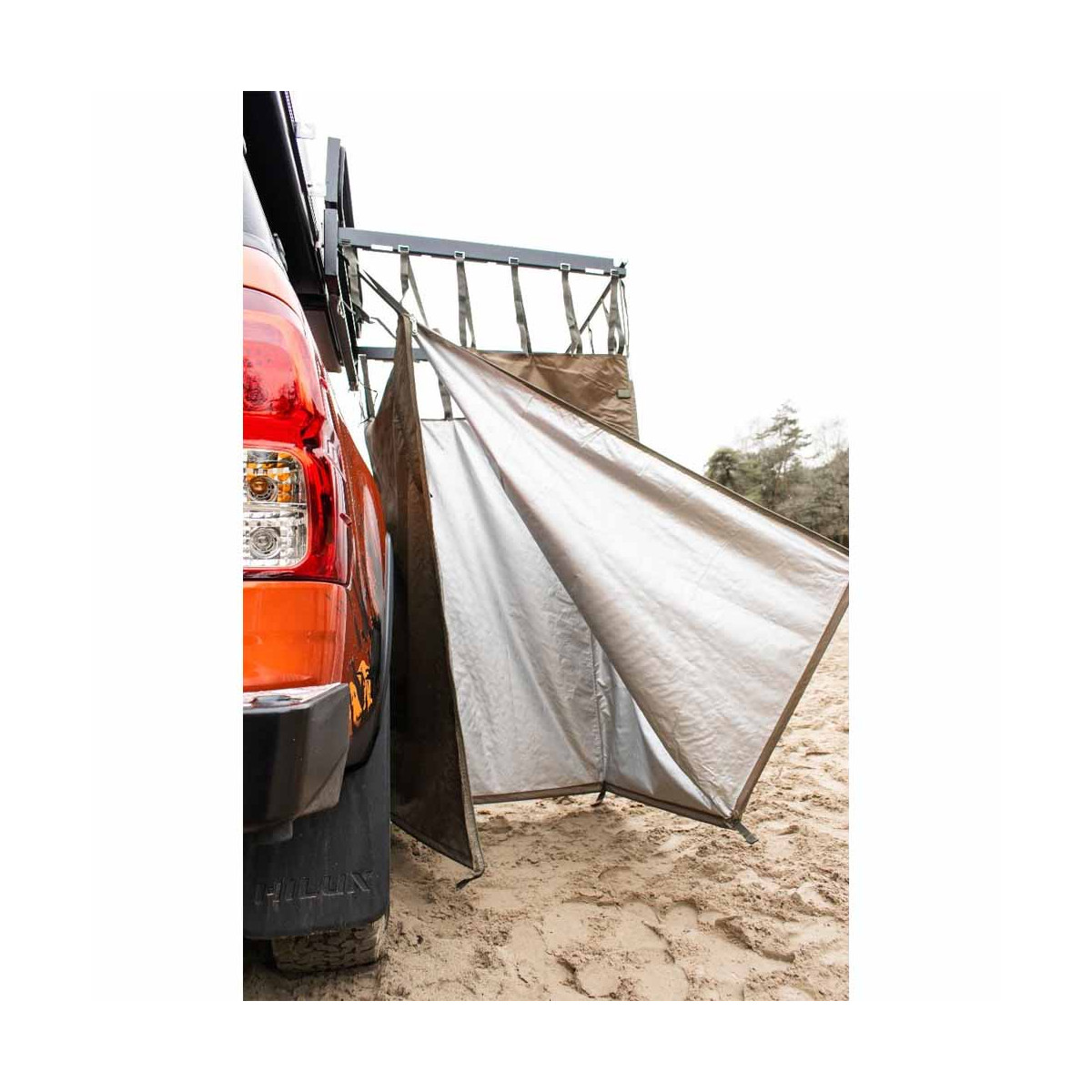 En quelques secondes, la box s'ouvre et laisse tomber un rideau de douche en toile de haute qualité, offrant un espace privé pour se doucher, se changer ou utiliser les toilettes. L'intérieur argenté du rideau réfléchit la lumière pour une sensation d'espace et de clarté, tandis que l'extérieur vert safari se fond dans l'environnement naturel.