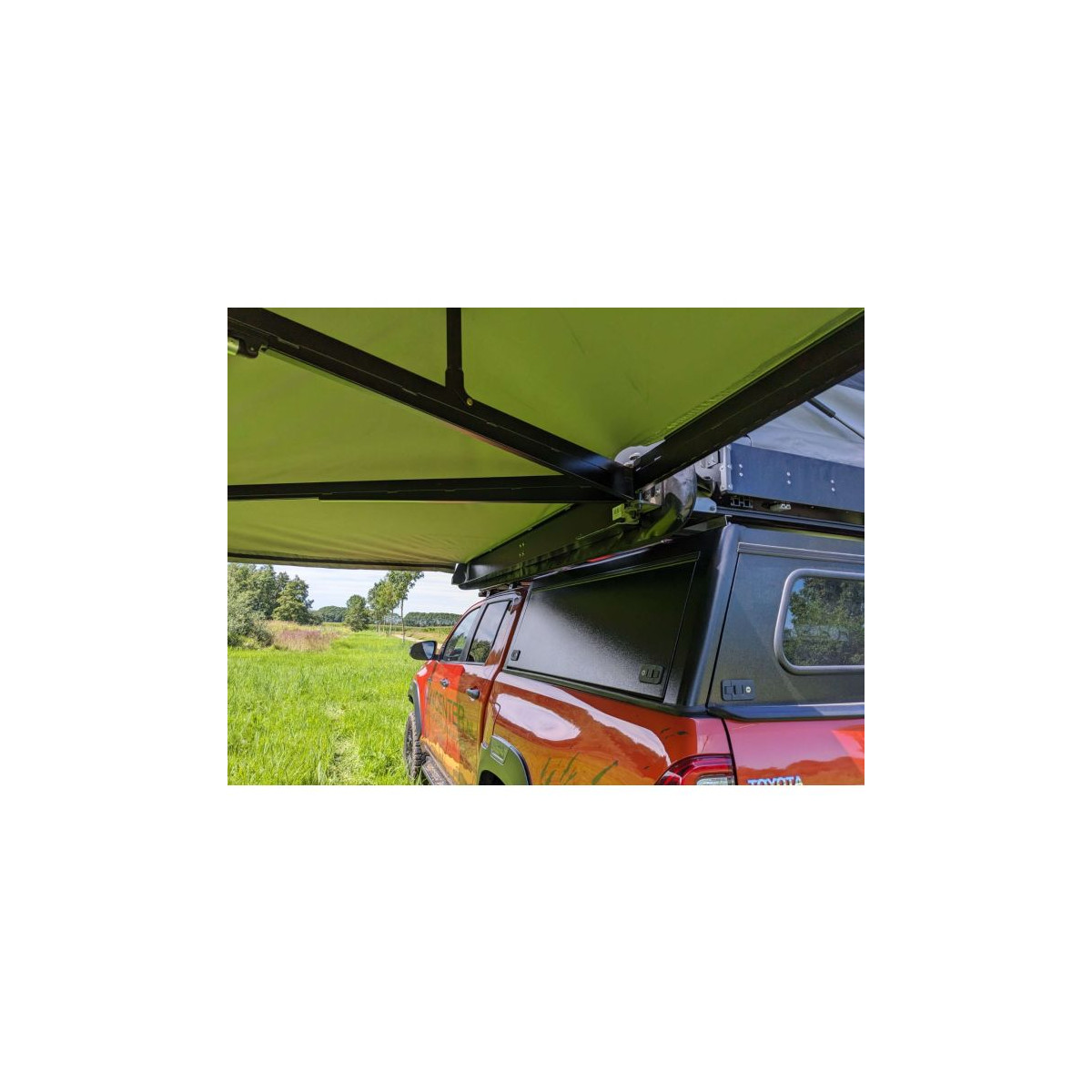 La toile de l’auvent est fabriquée en tissu TenCate de haute qualité avec une doublure argentée, qui réfléchit efficacement la chaleur et maintient un espace frais et ombragé, même sous un soleil intense. Son design sans pieds, combiné à sa robustesse, assure une stabilité optimale sans compromis sur la durabilité. Le Quick Pitch 180° est la solution idéale pour ceux qui recherchent un auvent compact, facile à installer et capable de résister aux conditions les plus difficiles.