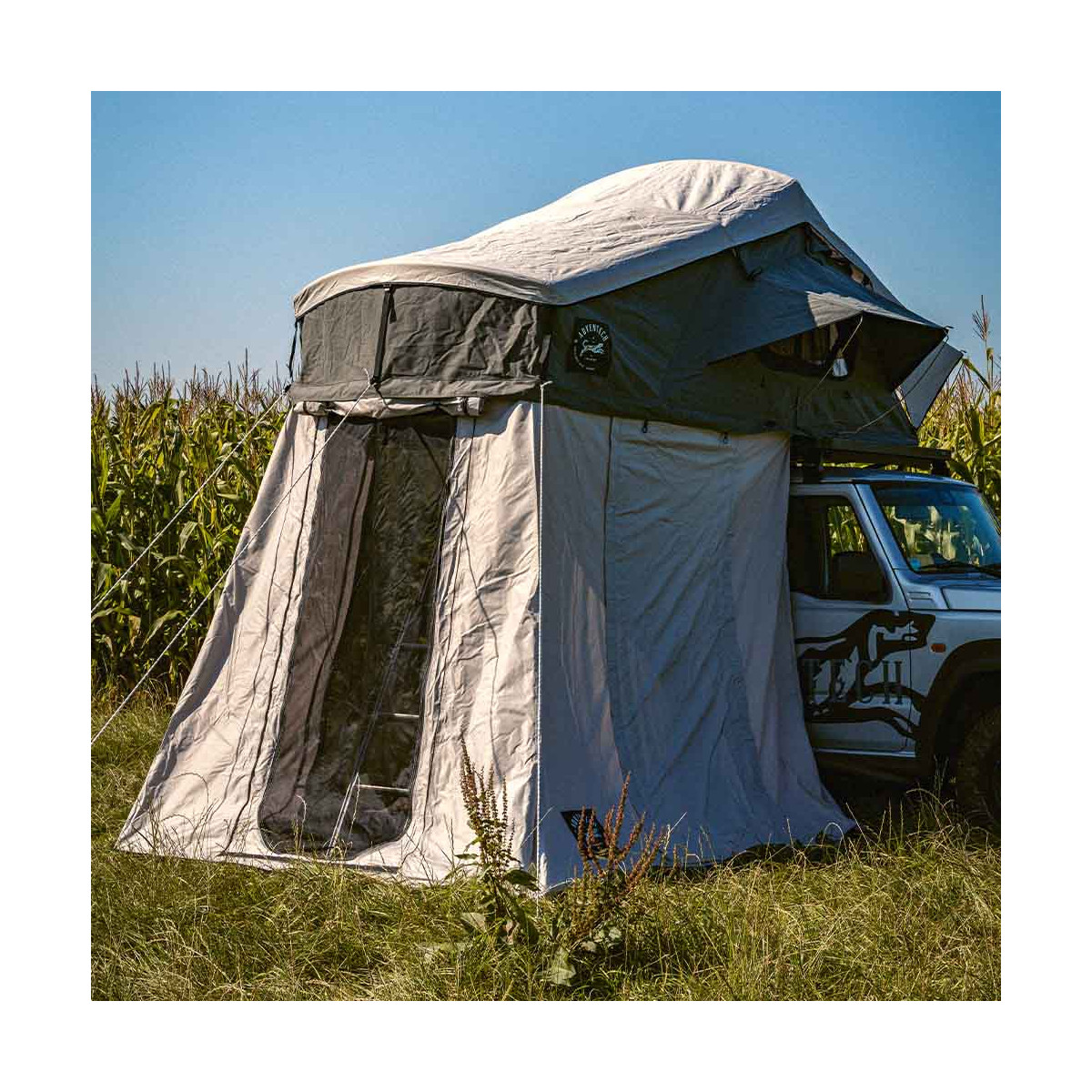 Transformez votre aventure avec l'annexe Adventech M140, offrant un espace de vie supplémentaire et protégé sous votre tente de toit.