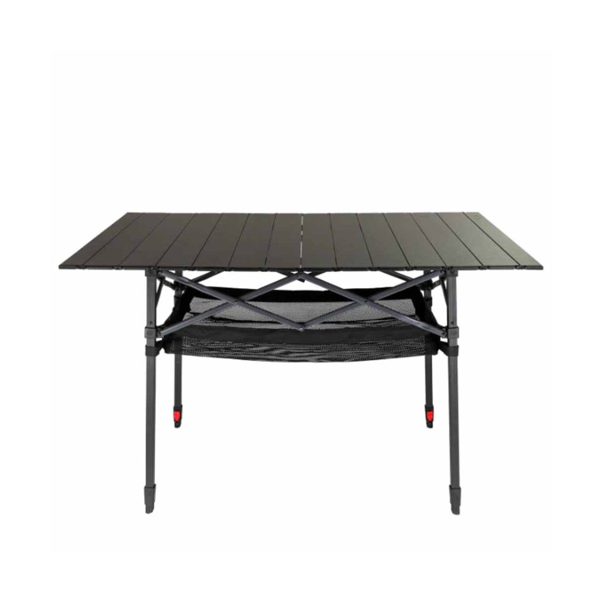 Table de camping robuste avec rangement pratique et pieds réglables.