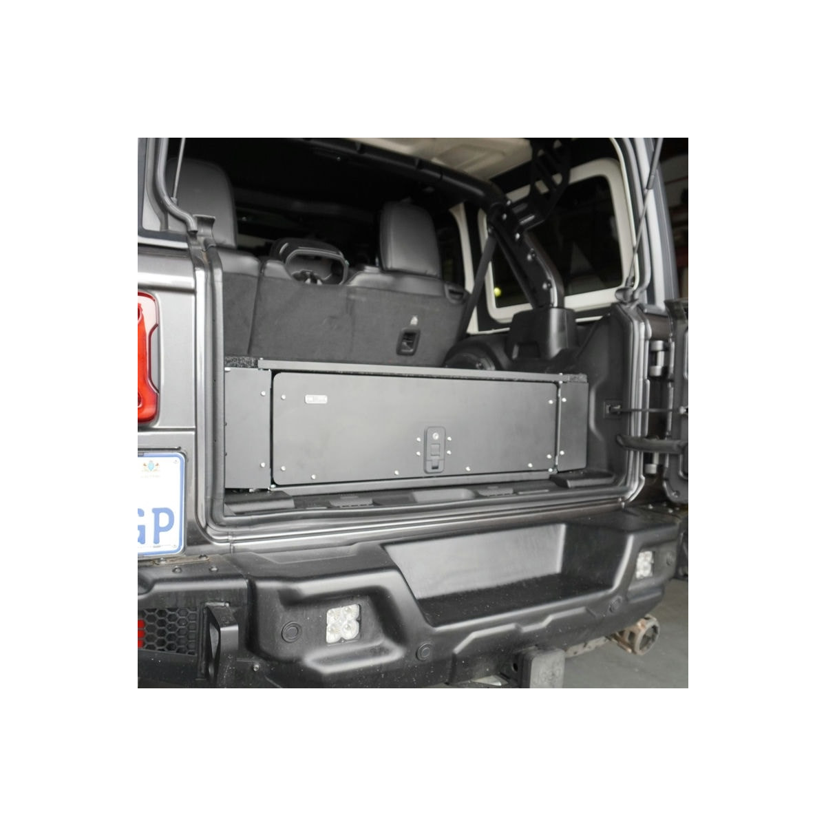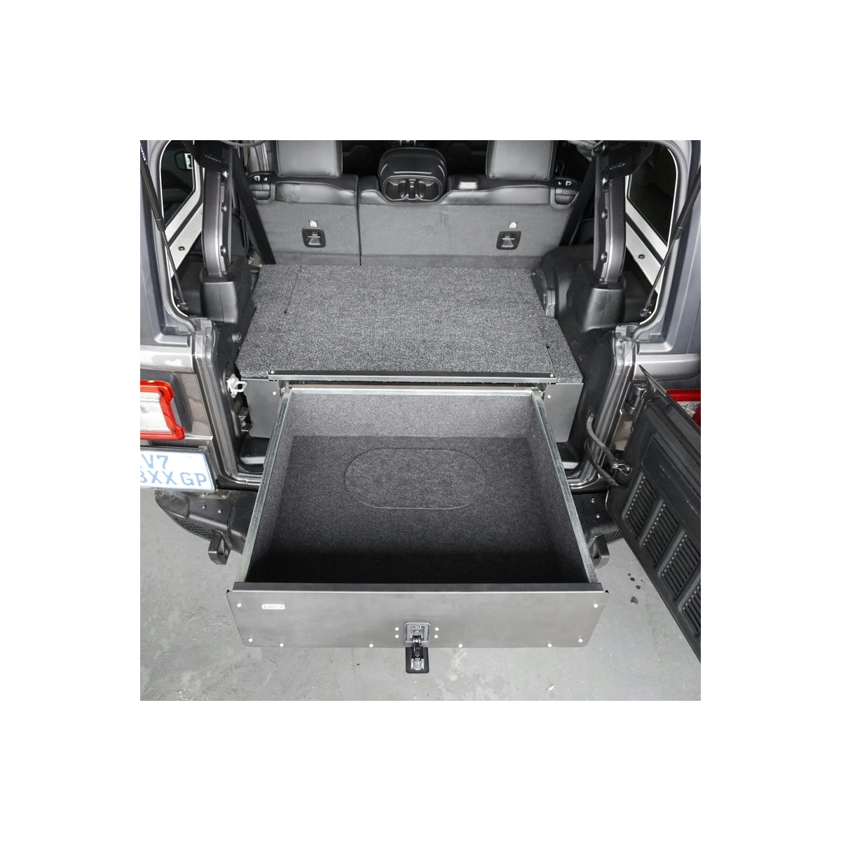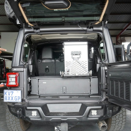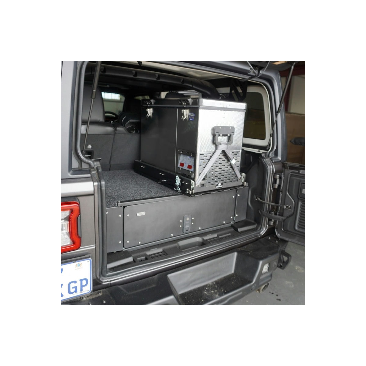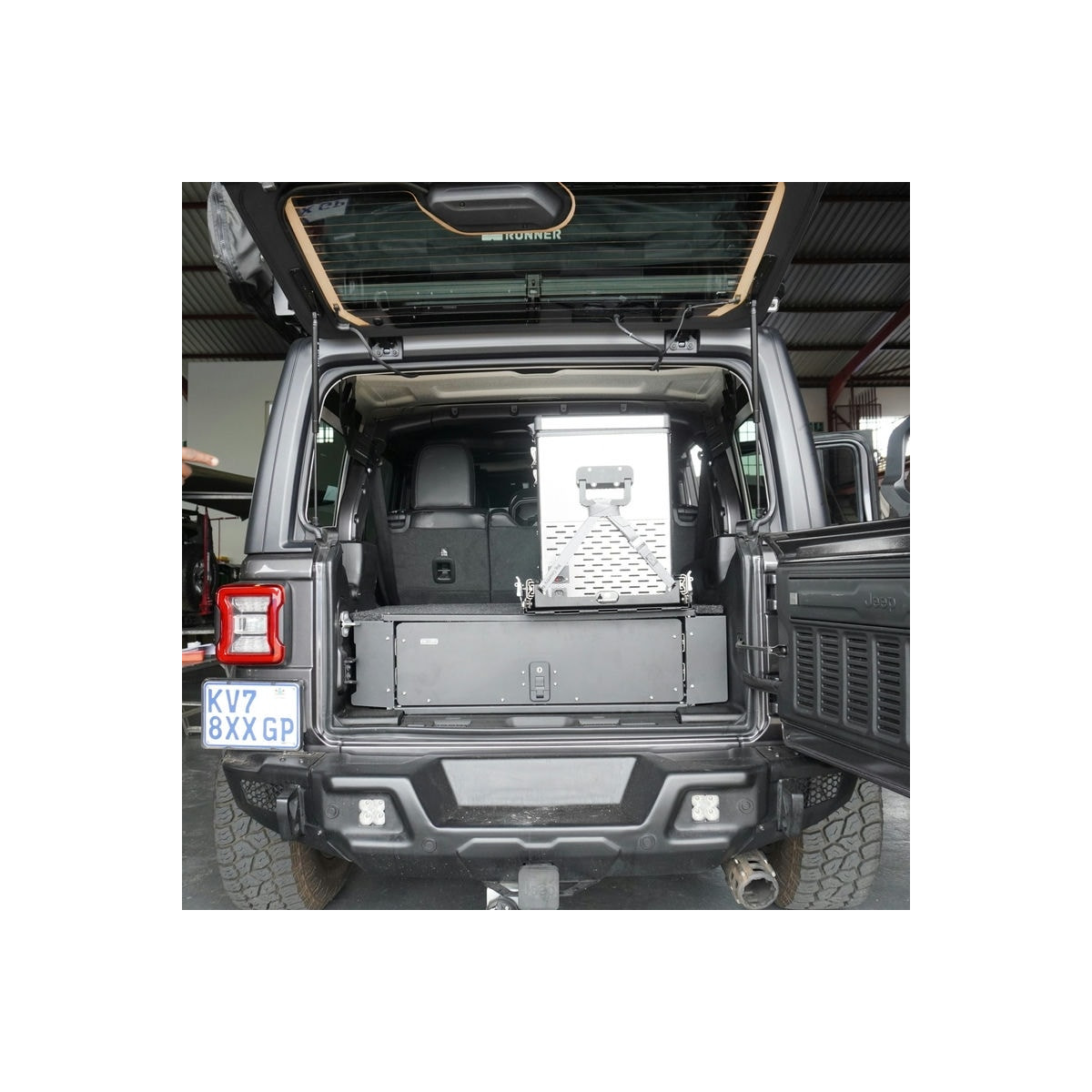 Les panneaux latéraux amovibles s'adaptent parfaitement à votre Jeep Wrangler, offrant un accès pratique à des espaces de rangement supplémentaires pour des équipements comme des compresseurs ou des batteries. Les tiroirs glissent sur des roulements scellés et peuvent supporter jusqu'à 150 kg chacun, avec un intérieur tapissé pour protéger vos effets personnels.