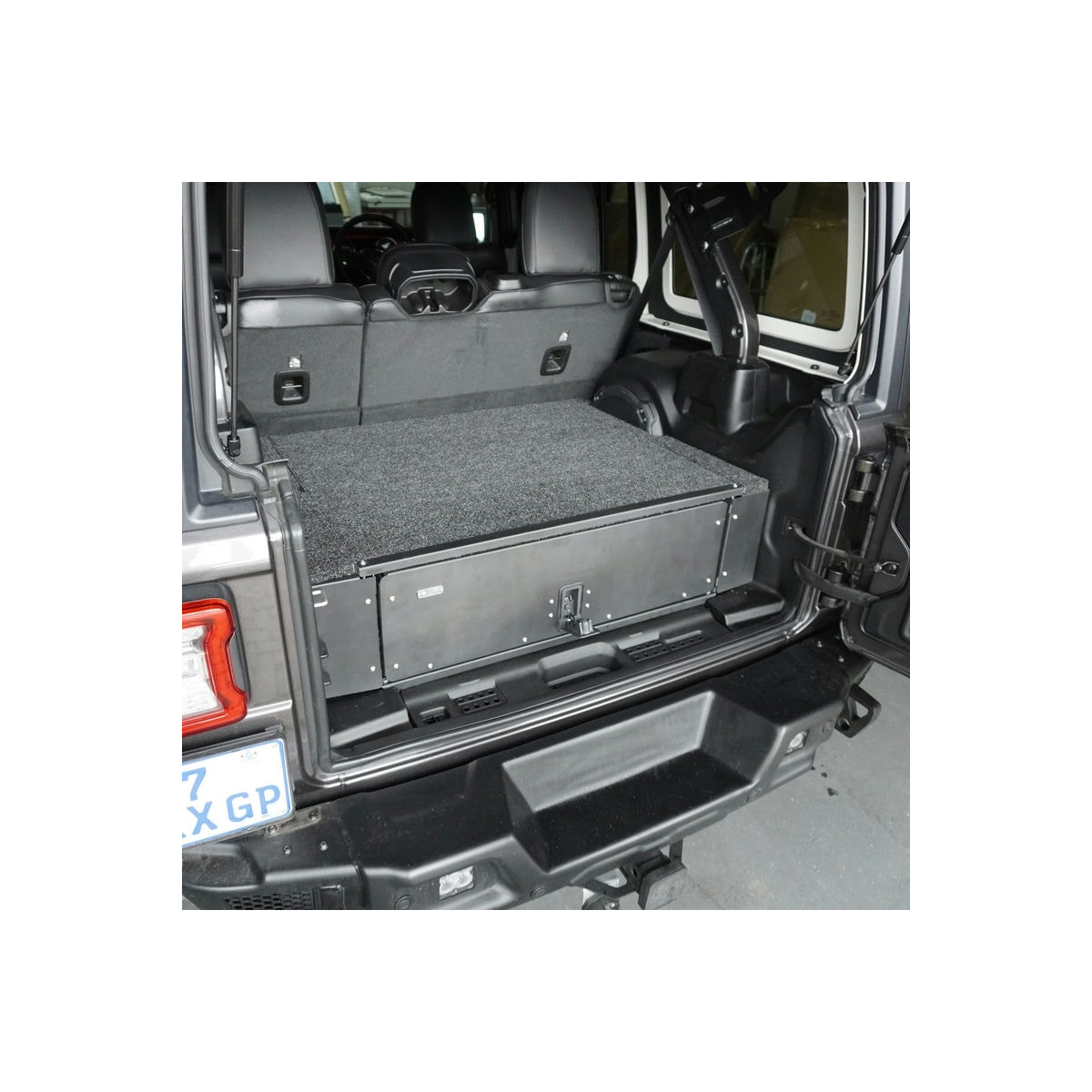 Les tiroirs se verrouillent automatiquement à la fermeture pour éviter les vibrations pendant le trajet et peuvent être sécurisés avec une serrure à clé. En somme, cette ladekast augmente la fonctionnalité de votre Jeep Wrangler pour toutes les applications possibles.