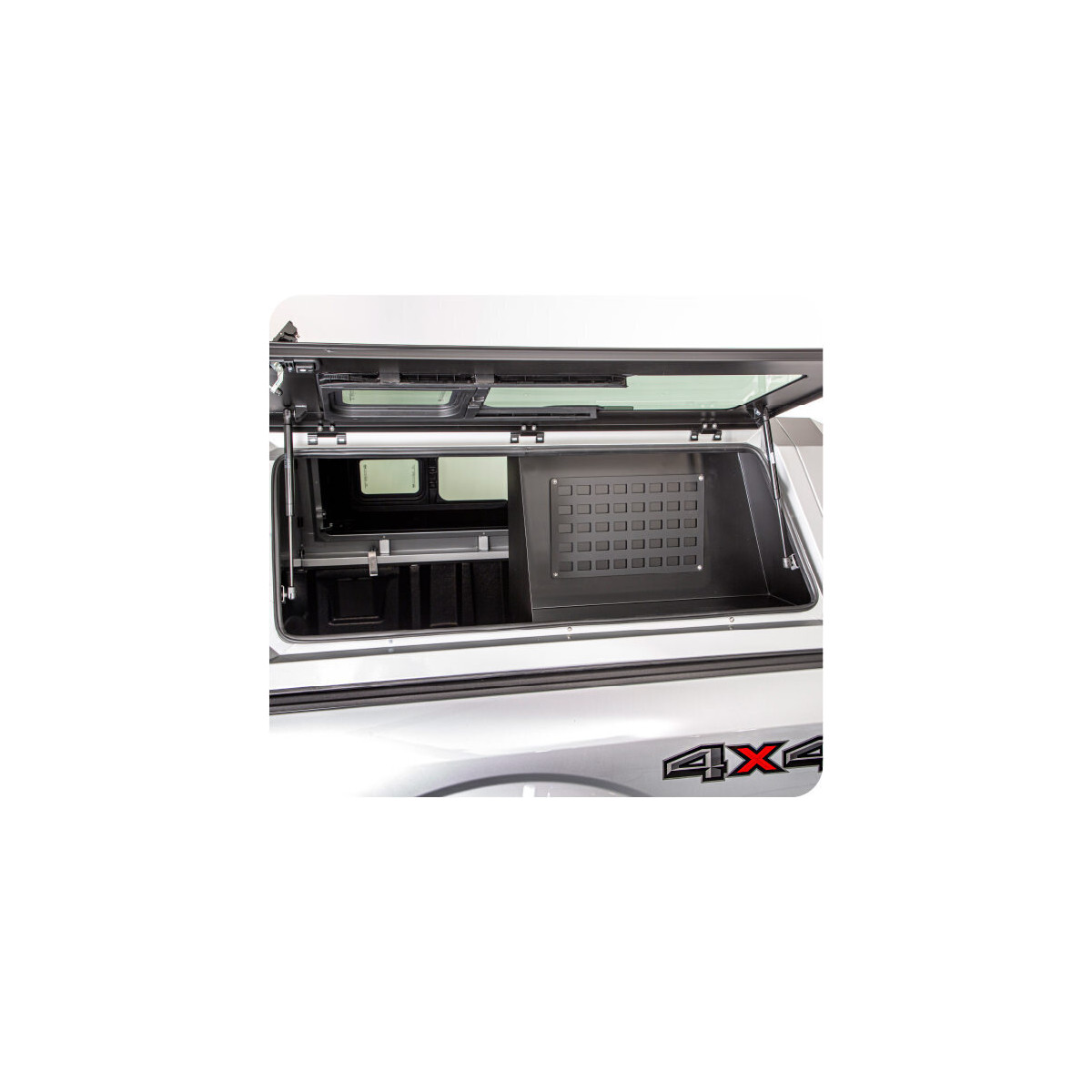 Améliorez la fonctionnalité de votre hardtop avec le demi-bac de rangement. Fabriqué avec des matériaux de haute qualité, ce rangement robuste offre une protection supérieure contre les éléments, en plus d'ajouter un espace de rangement précieux à votre véhicule. Le bac de rangement est conçu pour s'adapter parfaitement à votre hardtop RSI Smartcap, mettant en valeur son style tout en améliorant ses capacités. Sa construction durable garantit une protection maximale contre les intempéries. Grâce à sa structure bien pensée, le bac de rangement pour hardtop RSI SMARTCAP augmente l'espace de chargement de votre pick-up, vous permettant de transporter plus de bagages et d'équipements. Que vous soyez en déplacement professionnel ou en overlanding, ce rangement vous permettra de transporter tout ce dont vous avez besoin.