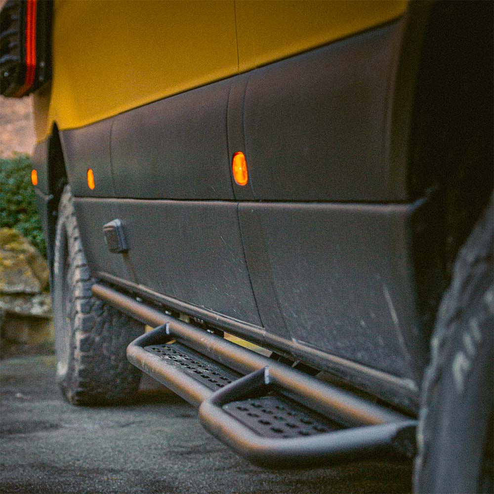- Gemakkelijke Toegang en Zijdelingse Bescherming: De robuuste Sequoia Treeplanken (Dutch Van Parts) maken het instappen in deze verhoogde Sprinter gemakkelijker en beschermen de dorpels tegen steenslag of kleine schokken.