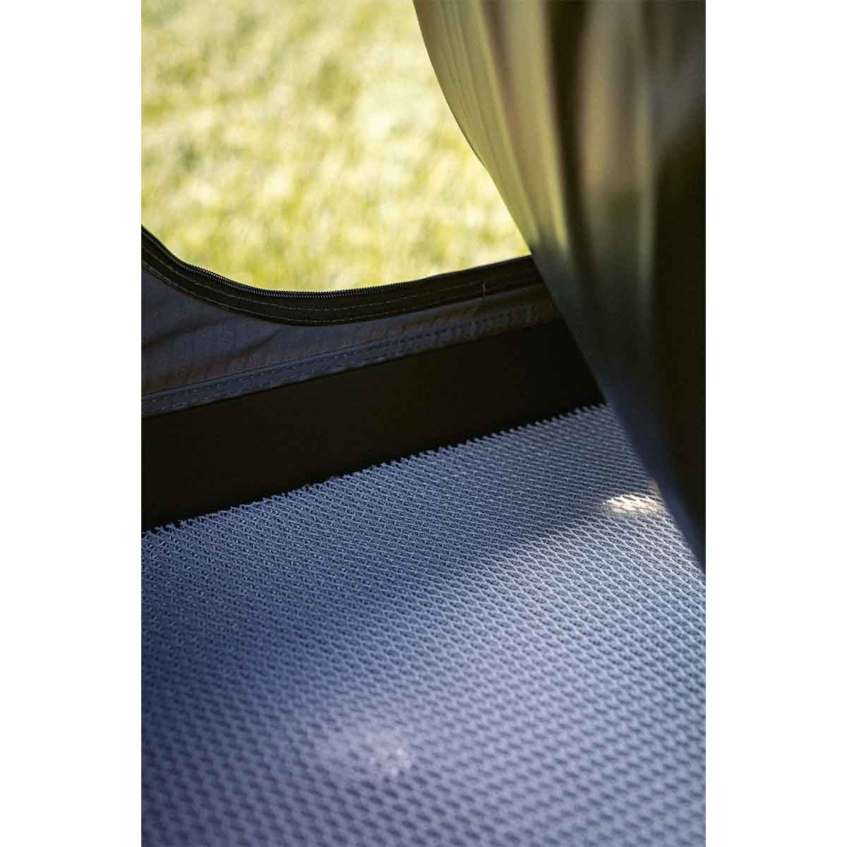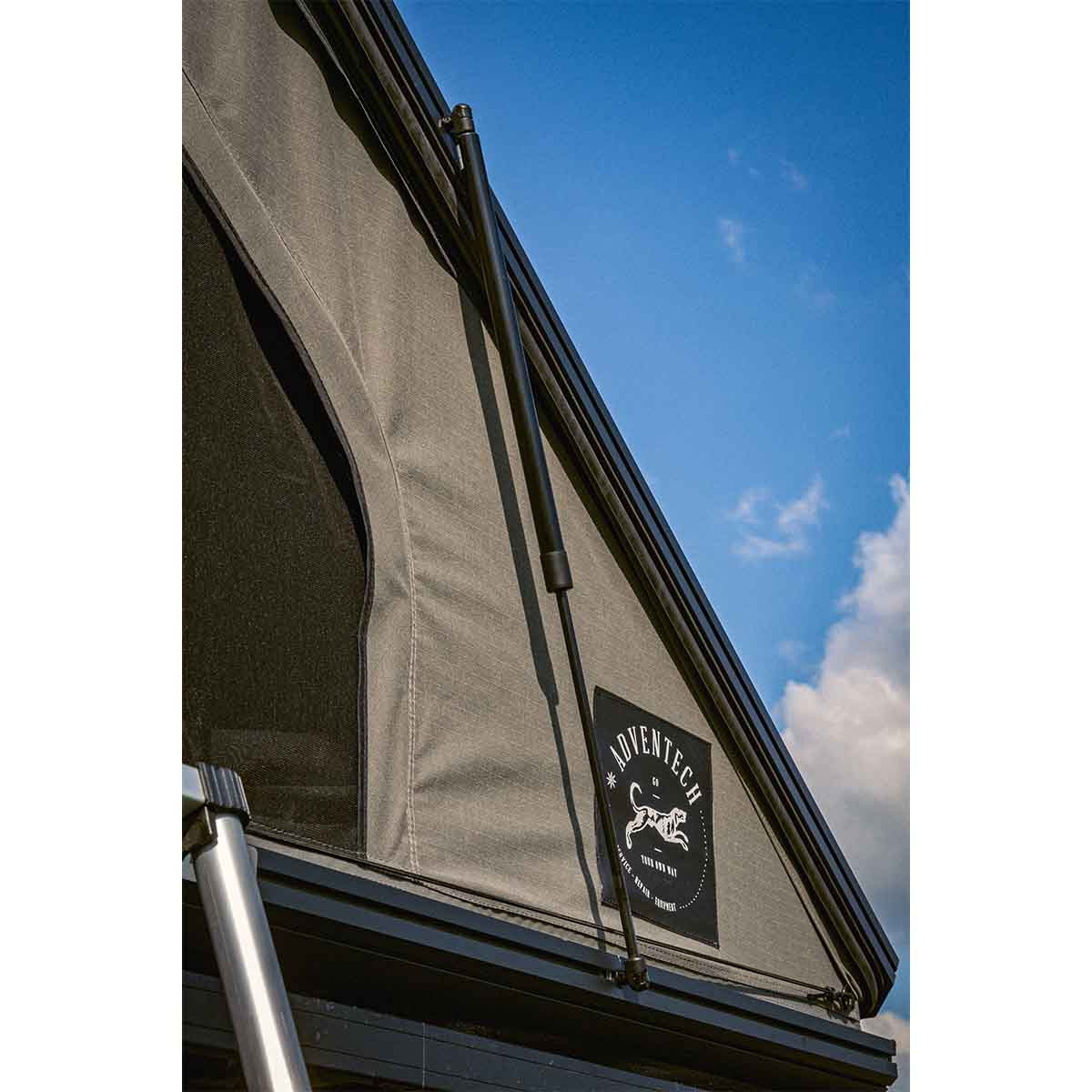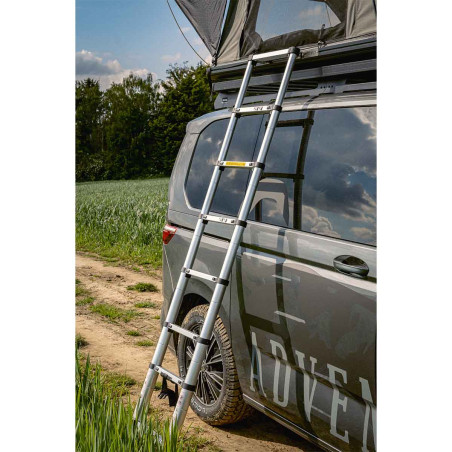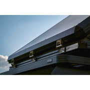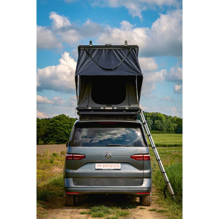 Met een binnenruimte van 220cm lang is het bijzonder geschikt voor lange mensen. De nokhoogte van 155cm maakt het mogelijk om op de knieën te zitten. Deze comfortabele daktent kan 2 tot 3 personen herbergen en opent in 60 seconden dankzij pneumatische veren. Het lage profiel van 18cm verbetert de aerodynamica en vermindert het brandstofverbruik. De grote openingen met kleppen over de ritssluitingen, de waterdichte en zelfherstellende SBS-ritssluitingen, evenals de met rits afsluitbare horren op alle openingen, garanderen een optimale ventilatie en bescherming tegen insecten.
