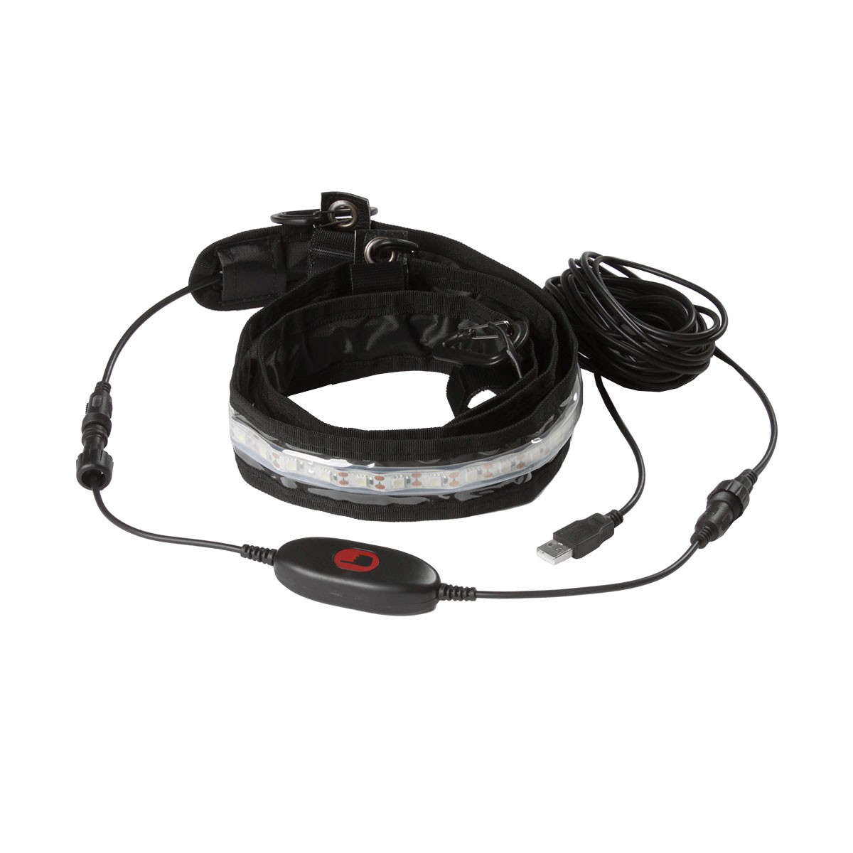 | Inhoud | 1 x 1,2 meter LED-lichtstrip met siliconen behuizing, 3 x ophangstroken met haken en lussen en karabijnhaken, 1 x aanraakschakelaar/dimmer, 1 x 5 meter kabel met USB-stekker en waterdichte connectoren, 1 x draagtas |