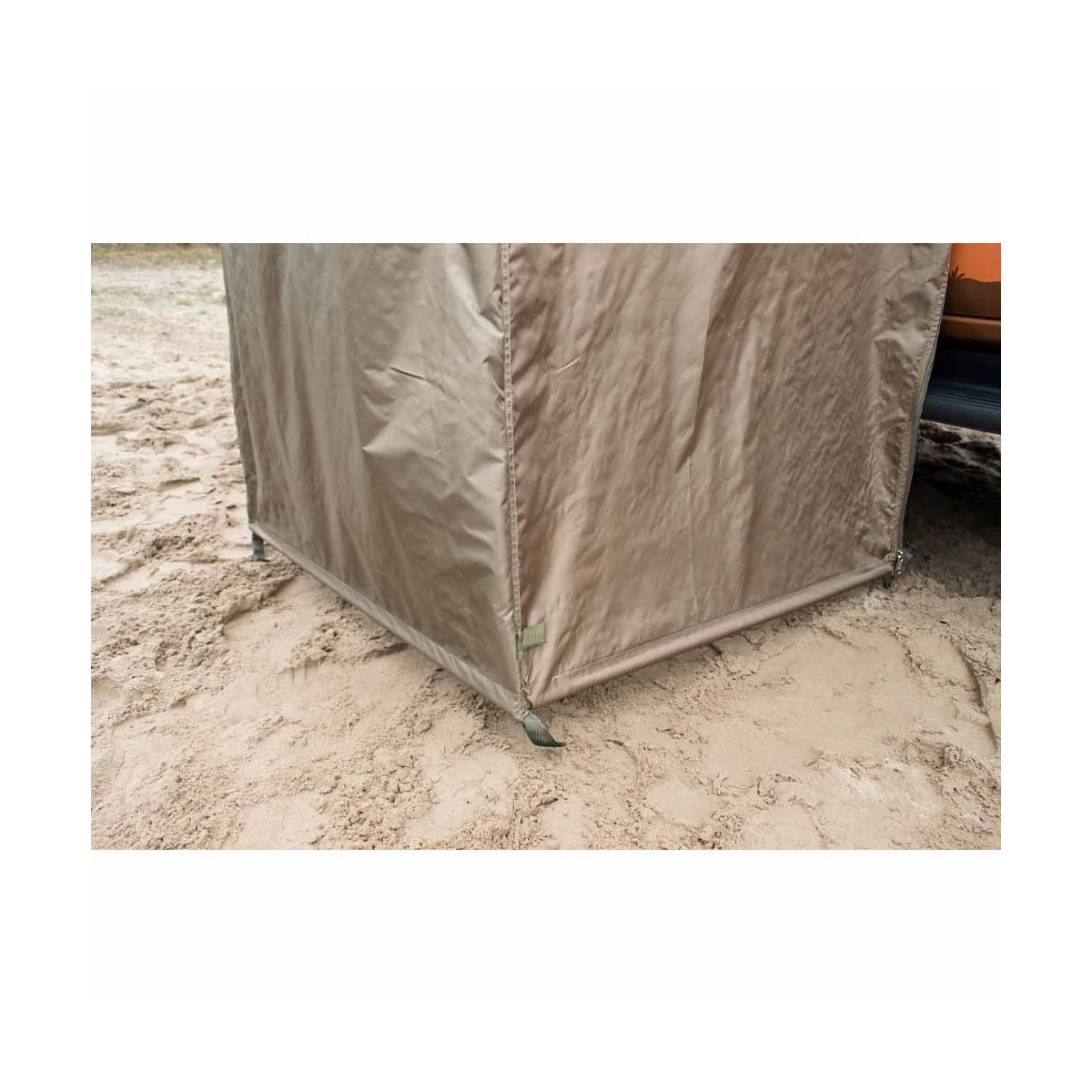 Om zich aan te passen aan alle voertuiggroottes en gebruikers van alle lengtes, is het gordijn uitgerust met verstelbare banden die een gemakkelijke hoogteverstelling mogelijk maken. Een ritssluiting over de gehele hoogte van het gordijn vergemakkelijkt de toegang, en de verzwaarde zoom voorkomt dat het gordijn omhoog waait bij sterke wind. Haringen kunnen worden gebruikt om de hoeken vast te zetten bij zeer harde wind.