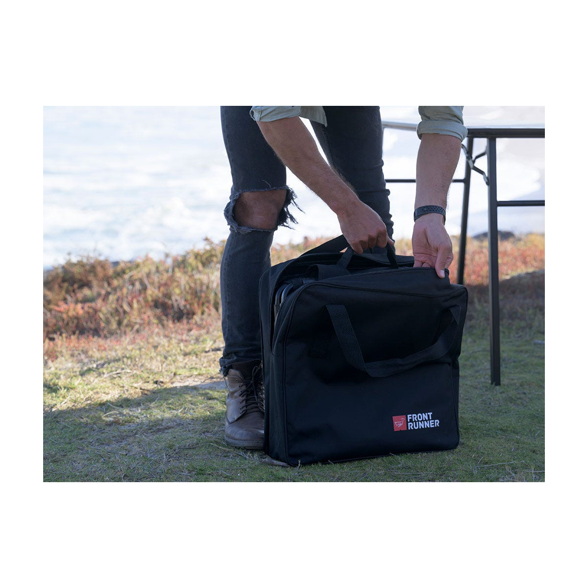 Berg twee Expander stoelen van Front Runner gemakkelijk op en vervoer ze met deze dubbele opbergtas. Gemaakt van duurzaam canvas beschermt deze tas je stoelen tegen de elementen en houdt ze in goede staat. Dankzij de ritssluiting en de twee ondersteunende riemen kan de tas extra gewicht dragen en trillingen tijdens het transport verminderen. De nylon randen zorgen voor extra stevigheid, waardoor optimale bescherming en een langere levensduur van je Expander stoelen gegarandeerd zijn.