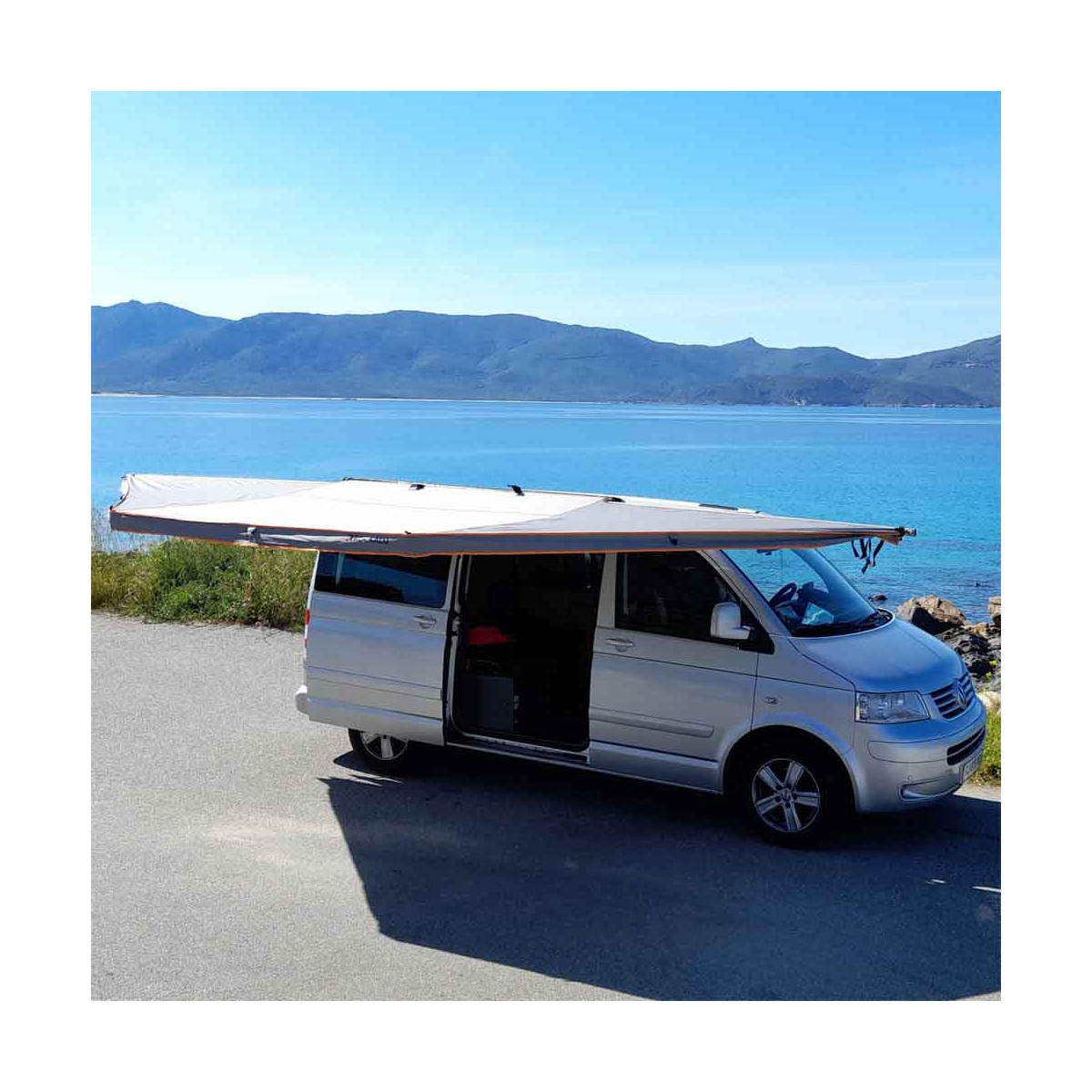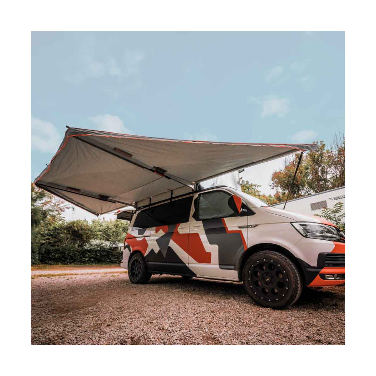 Het strakke en elegante ontwerp van de Rockalu 360° past perfect in uw omgeving en is geschikt voor alle situaties, of u nu kampeert, wandelt of een picknick houdt. Speciale bevestigingsbeugels zijn beschikbaar voor VW T6.1 / California (apart verkocht) en kunnen direct op het voertuig worden gemonteerd zonder boren.