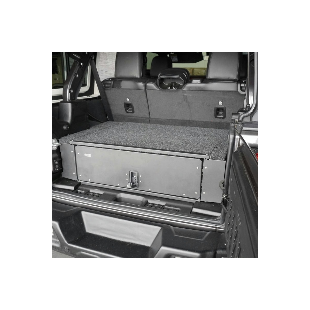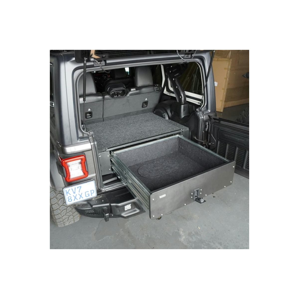 De ladekast Big Country voor de JEEP WRANGLER JL is ontworpen om de meest extreme omstandigheden te weerstaan. Getest in Zuid-Afrika, biedt deze dubbele ladekast een robuuste en duurzame opbergoplossing, ideaal voor avonturiers en professionals in offroad-omgevingen. De tapijtafwerking aan de bovenkant maakt het gemakkelijk om gereedschap, opbergdozen of koelkasten te verplaatsen zonder risico op krassen.