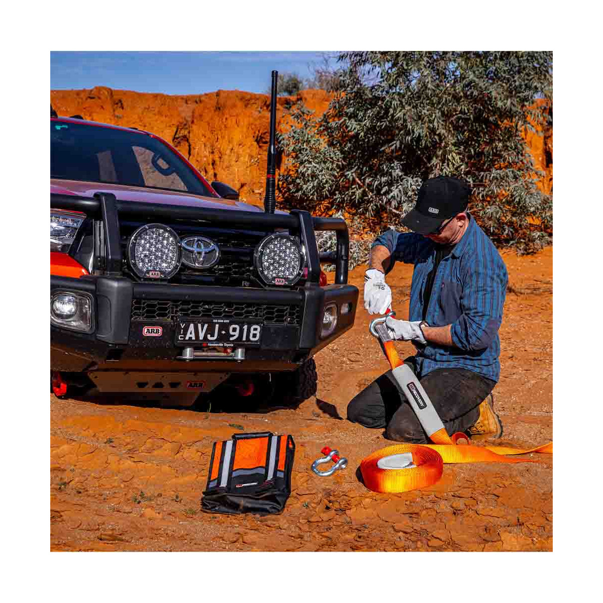 De kit bevat een ARB-sleepband van 17.600 lbs, twee gegalvaniseerde "S"-type schalmen met een capaciteit van 4,75 ton, een paar reddingshandschoenen met leren handpalm en versterkte rug, en een robuuste PVC-reddingszak met dubbele interne zakken versierd met het topografische ARB-patroon. De dubbele compartimenten bieden ruimte voor een reddingsdemper (apart verkrijgbaar) om uw weekendreddingsuitrusting compleet te maken.